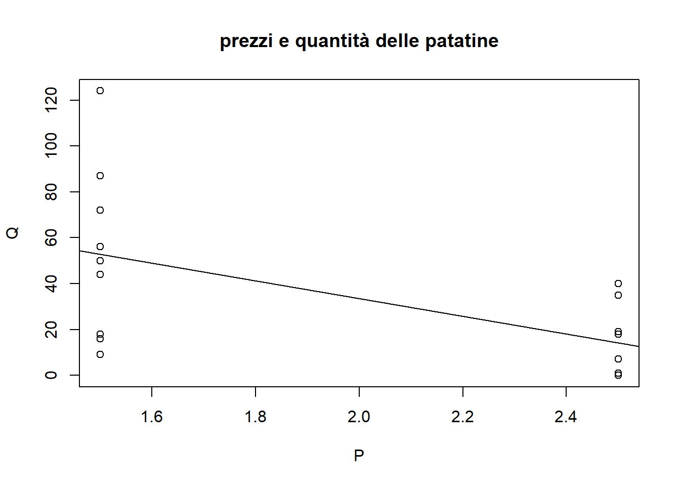 Si vede che i dati non sono effettivamente sufficienti, in quanto il prezzo osservato è binario. Tuttavia l’impatto medio e l’intercetta sono meglio di niente, e si vede che al crescere del prezzo si riduce la quantità venduta