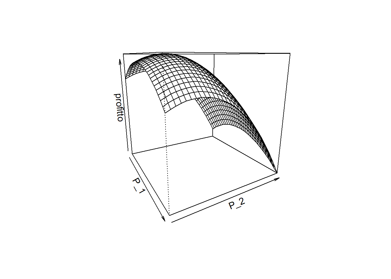 pro = outer(P_1, P_2, profitto2)persp(P_1, P_2, pro, zlab = "profitto", theta = 60)