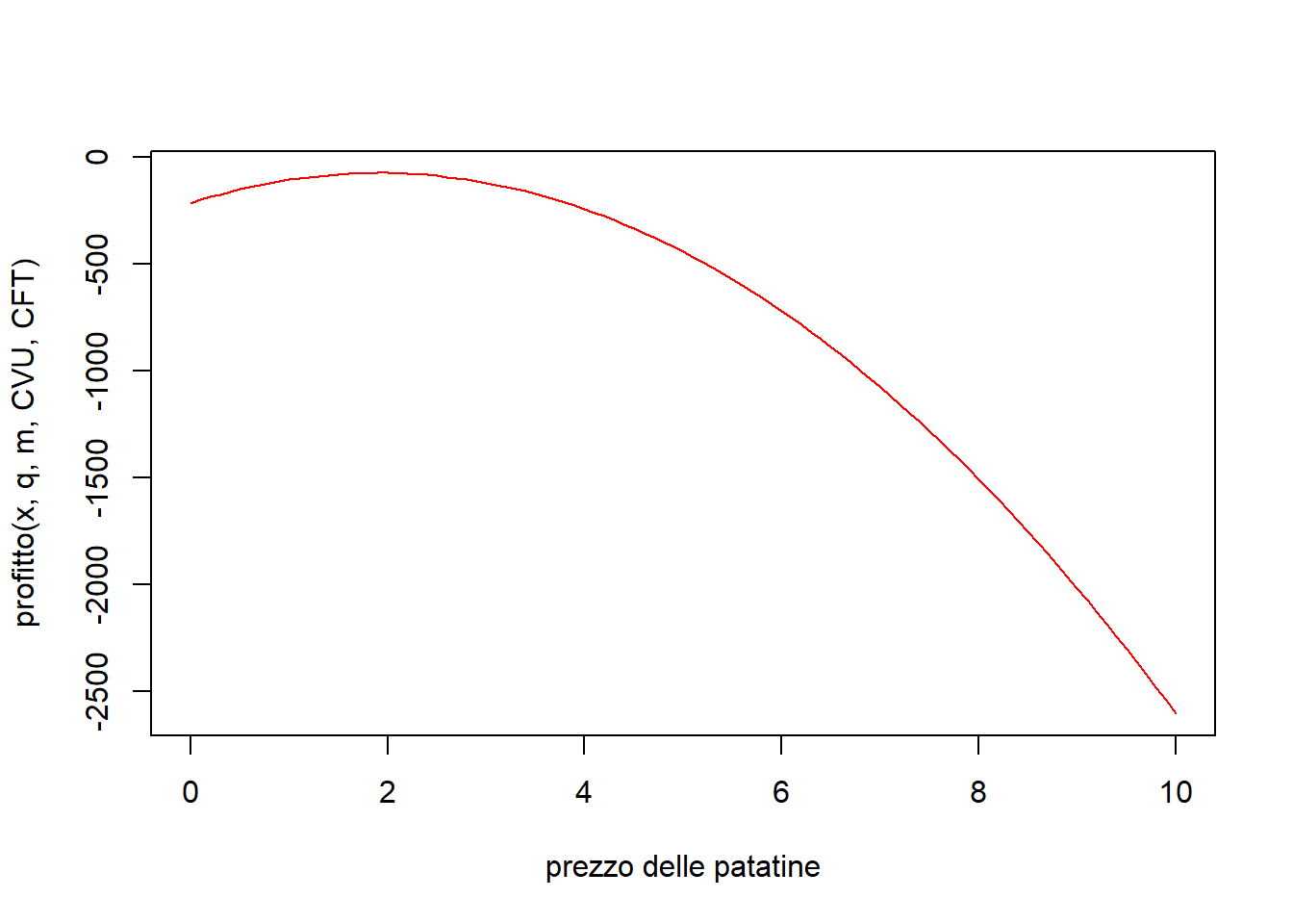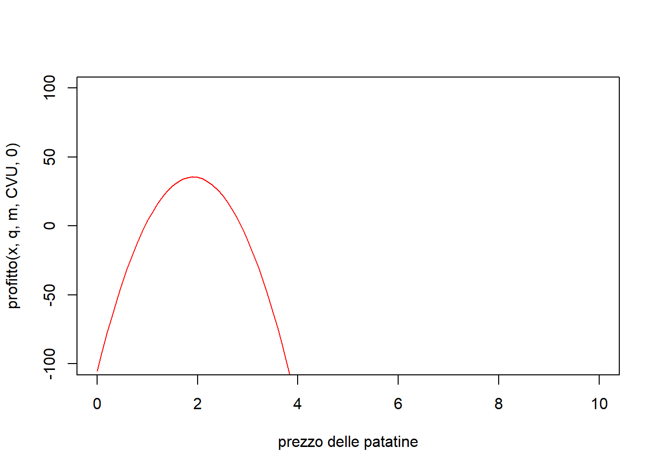 curve(profitto(x, q,m,CVU,CFT),0,10, col='red', xlab='prezzo delle patatine')