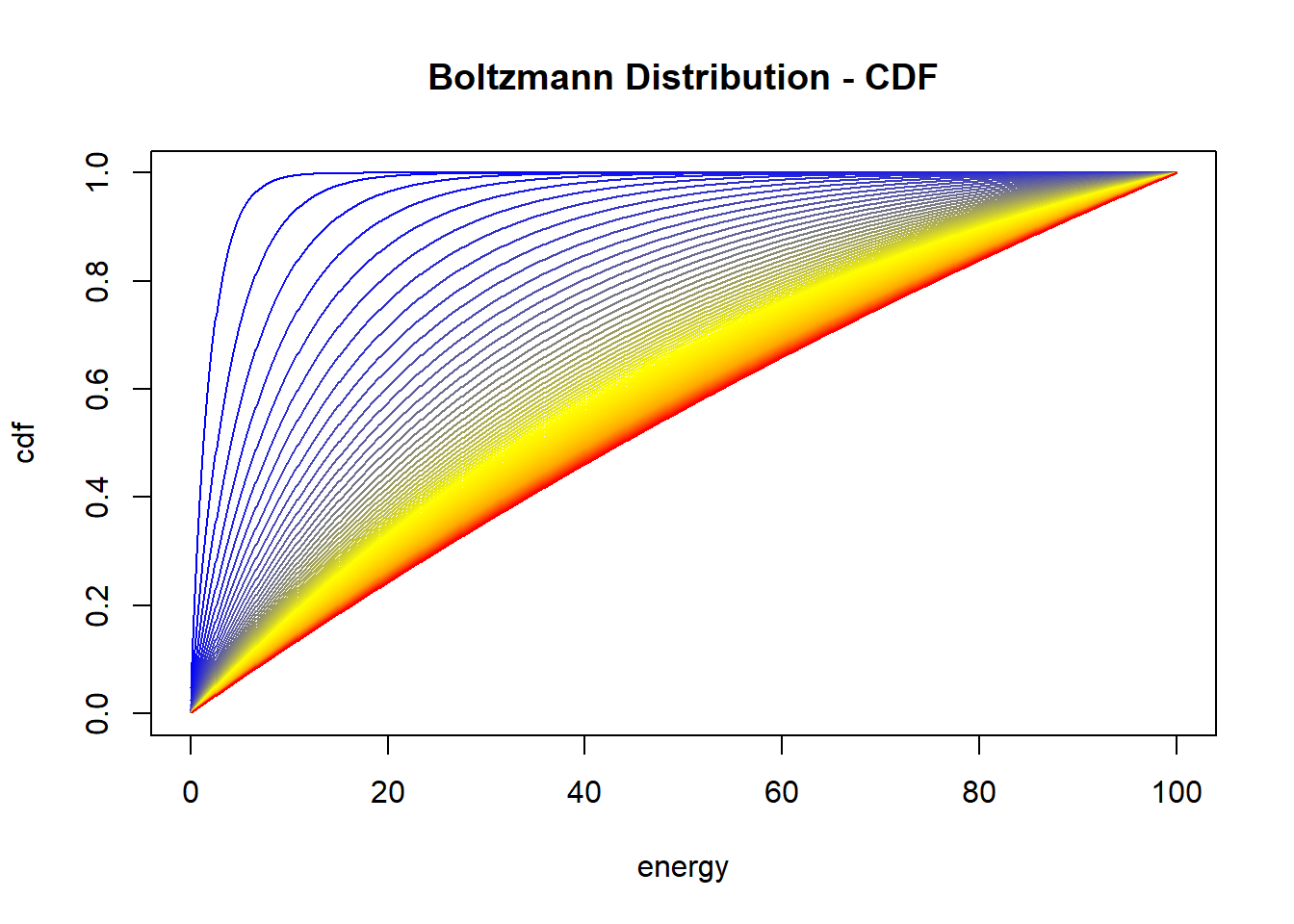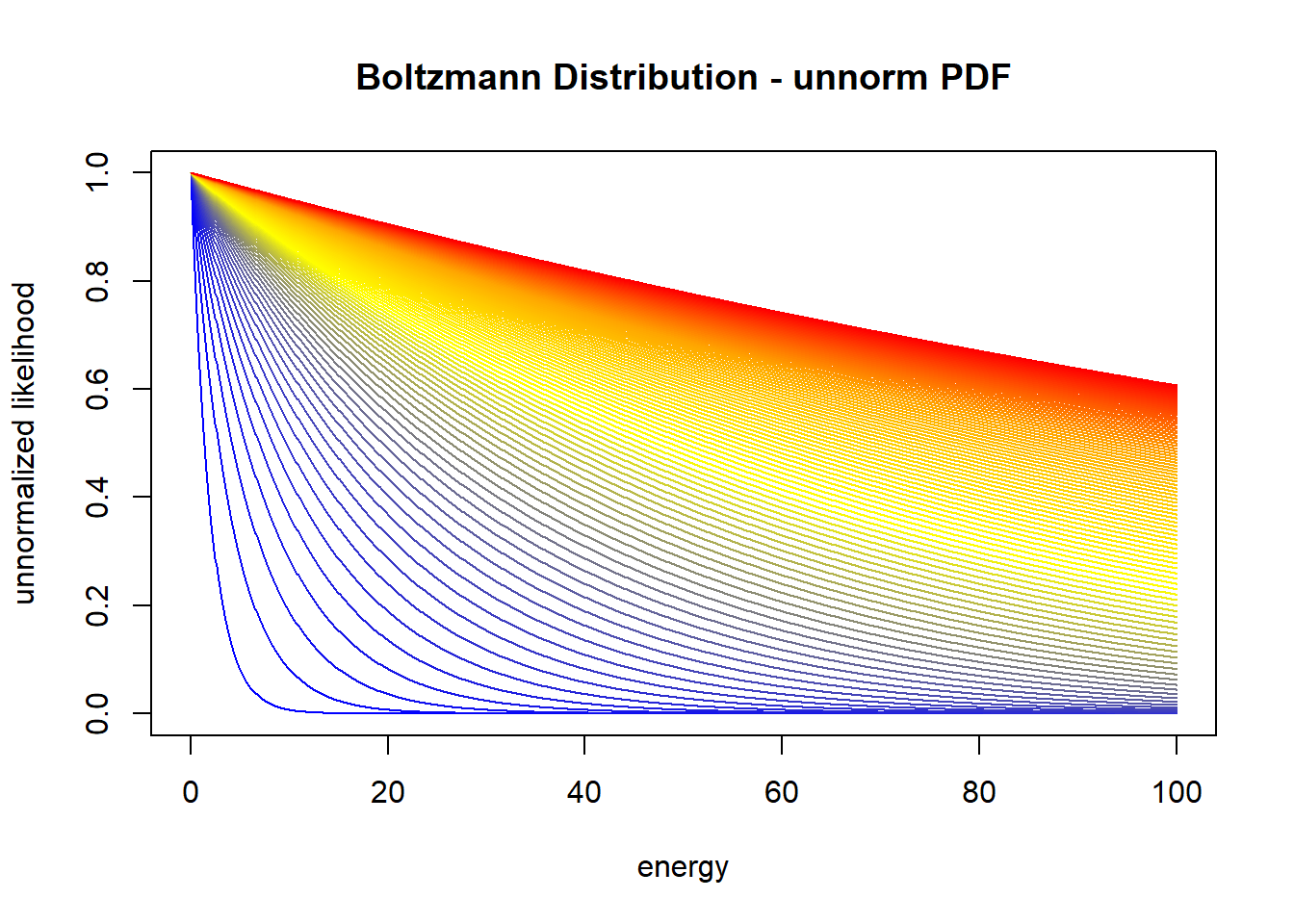 \(T\) è uno scalare positivo, che rappresenta la temperatura del sistema. Si vede che se \(T\) diventa alto il numeratore della pdf diventa \(\exp(0)=1\) per cui la distribuzione di Bolztmann diventa effettivamente una uniforme (gli stati hanno tutti la stessa probabilità di verificarsi)