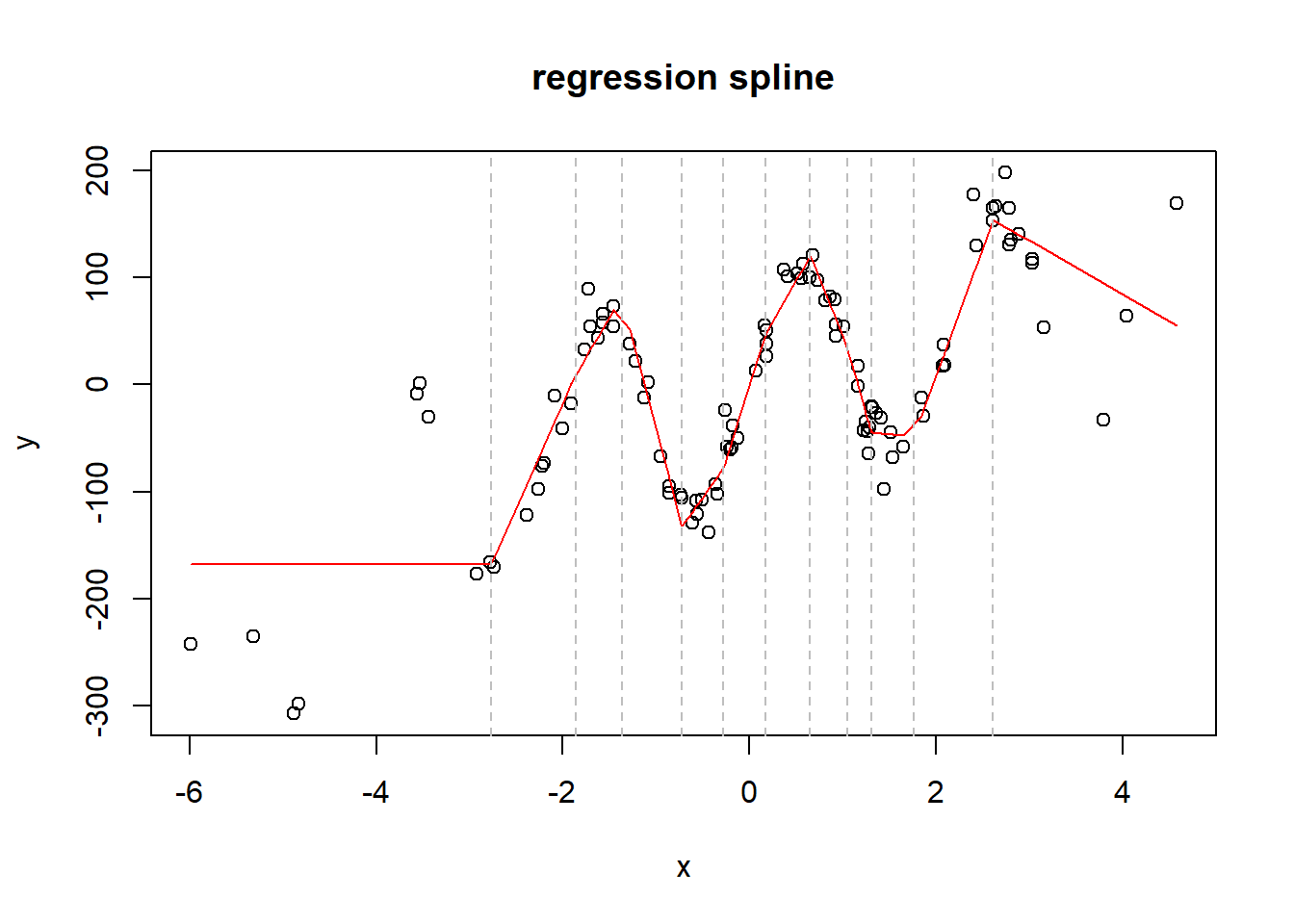 ##data generationN =103set.seed(42)x =rnorm(N, 0, 2)y =sin(x*3) *100+ x^2-exp(x) + x^3+rnorm(N,0, 20) +20*x##spline fitting##I choose the knots as some random quantiles of xmyk =quantile(x, seq(0,1,0.08))myk = myk[-c(1, length(myk))]xmat =rep(1,N)for (k in myk){ hinge_a = x - k hinge_a[hinge_a<0] =0 xmat =cbind(xmat, hinge_a)}df =data.frame(y=y)colnames(xmat) =paste0(colnames(xmat),1:ncol(xmat))df =cbind(df, xmat)spline =lm(y~.+0, data=df)preds =predict(spline, df)plot(x,y, main='regression spline')lines(x[order(x)],preds[order(x)], col='red')for (q in myk){abline(v=q, lty='dashed', col='grey')}
